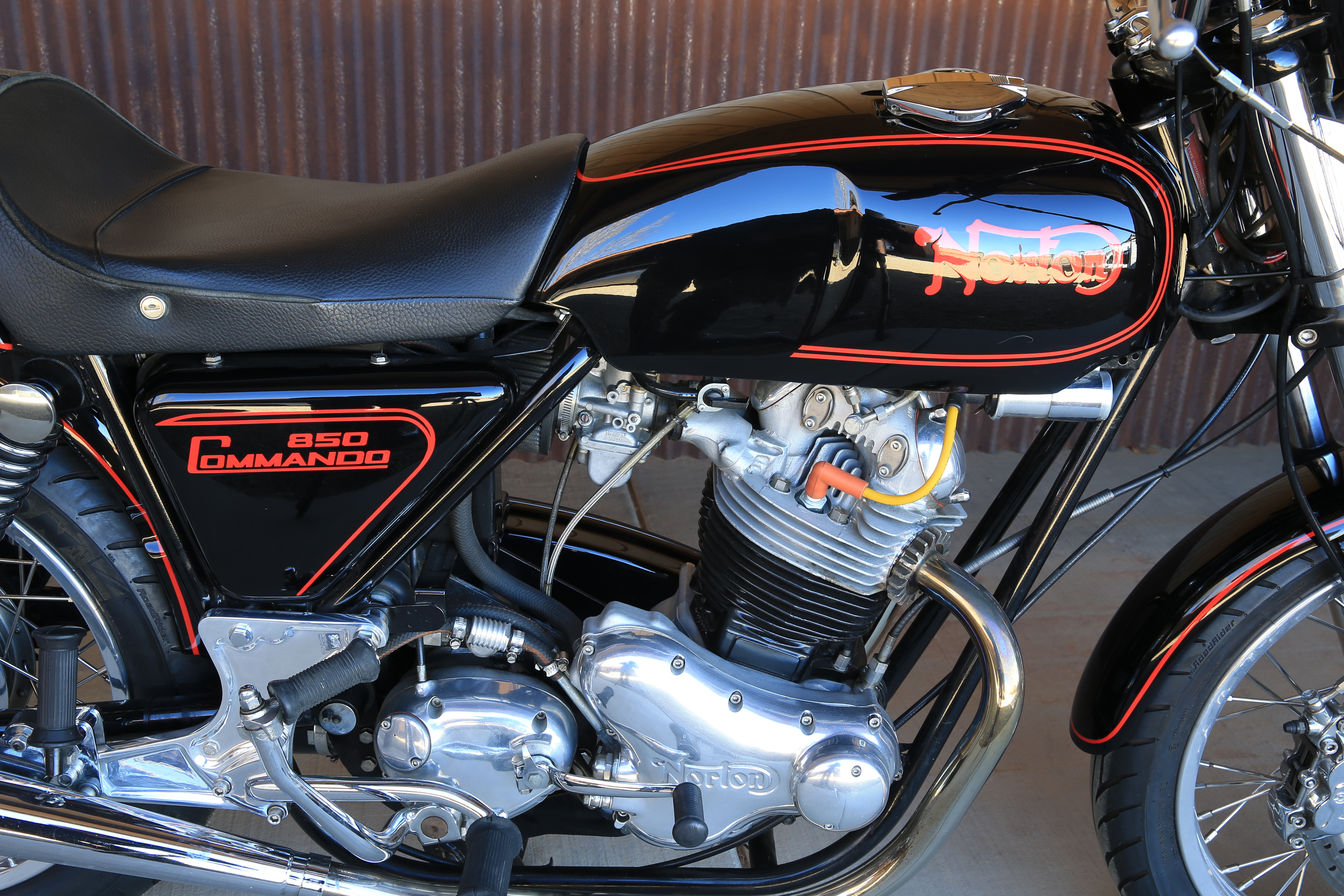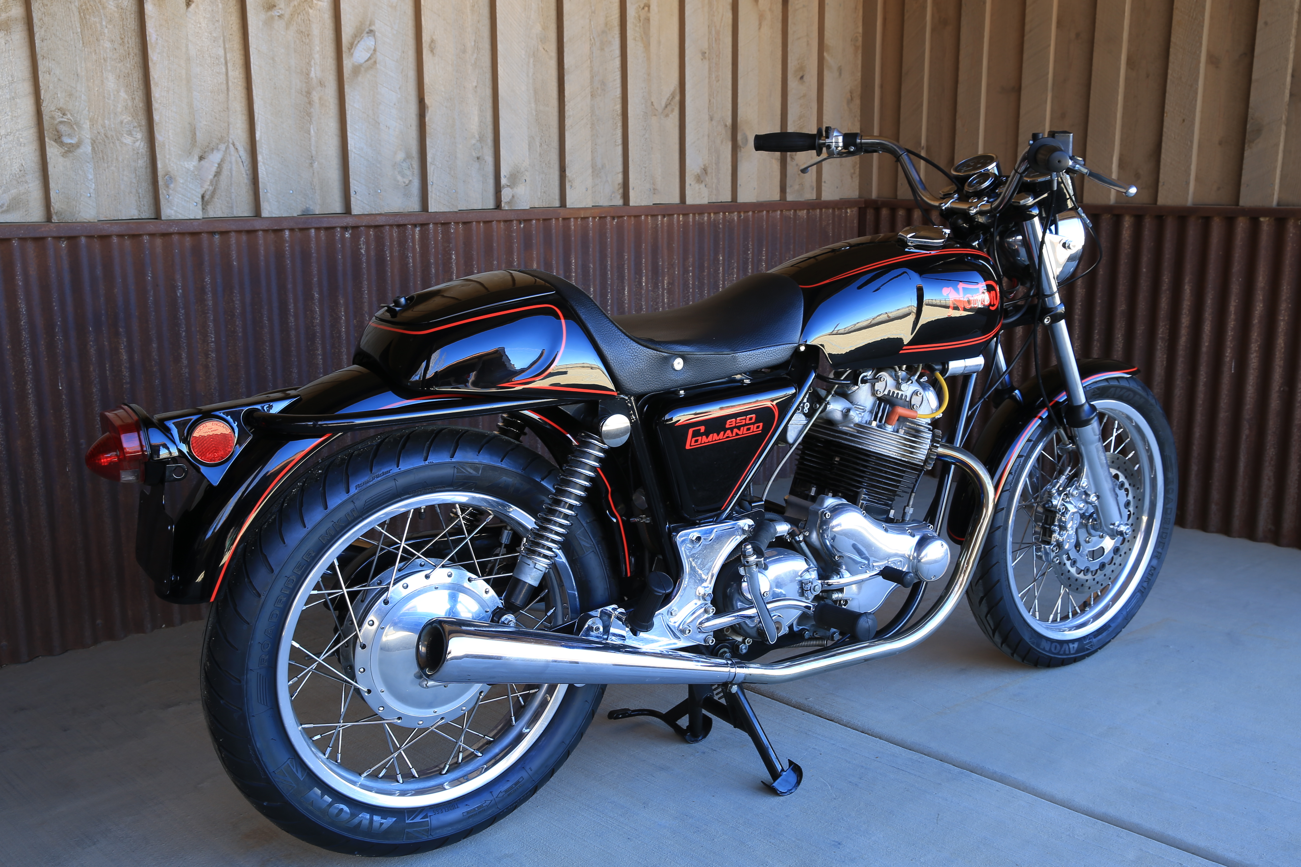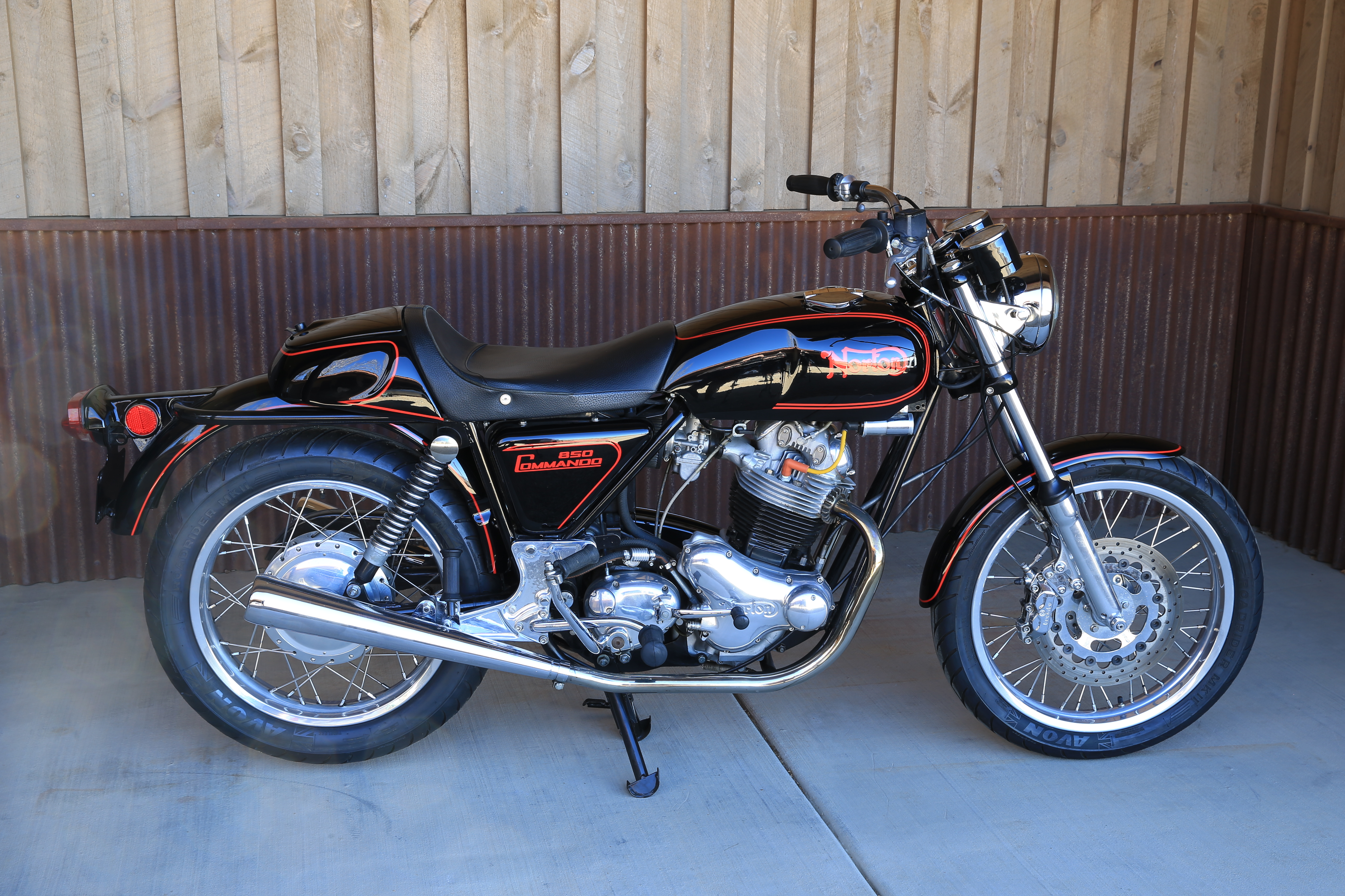 - Brief description: Very bold looking machine with its Red frame and Black body work. Like new condition with low miles. Very well taken care of. Option equipment includes Electronic gauges, a 1″ lowering kit, cNw Cafe’ LED turn signals and the awesome cNw dual Keihin carburetor kit. Bike is a 1971 frame and gear box but uses a 1974 850cc engine. As many will agree, the 1974 was maybe the best year of all Commando engines. It is ready to start enjoying and this bike makes a statement few British bikes can match.