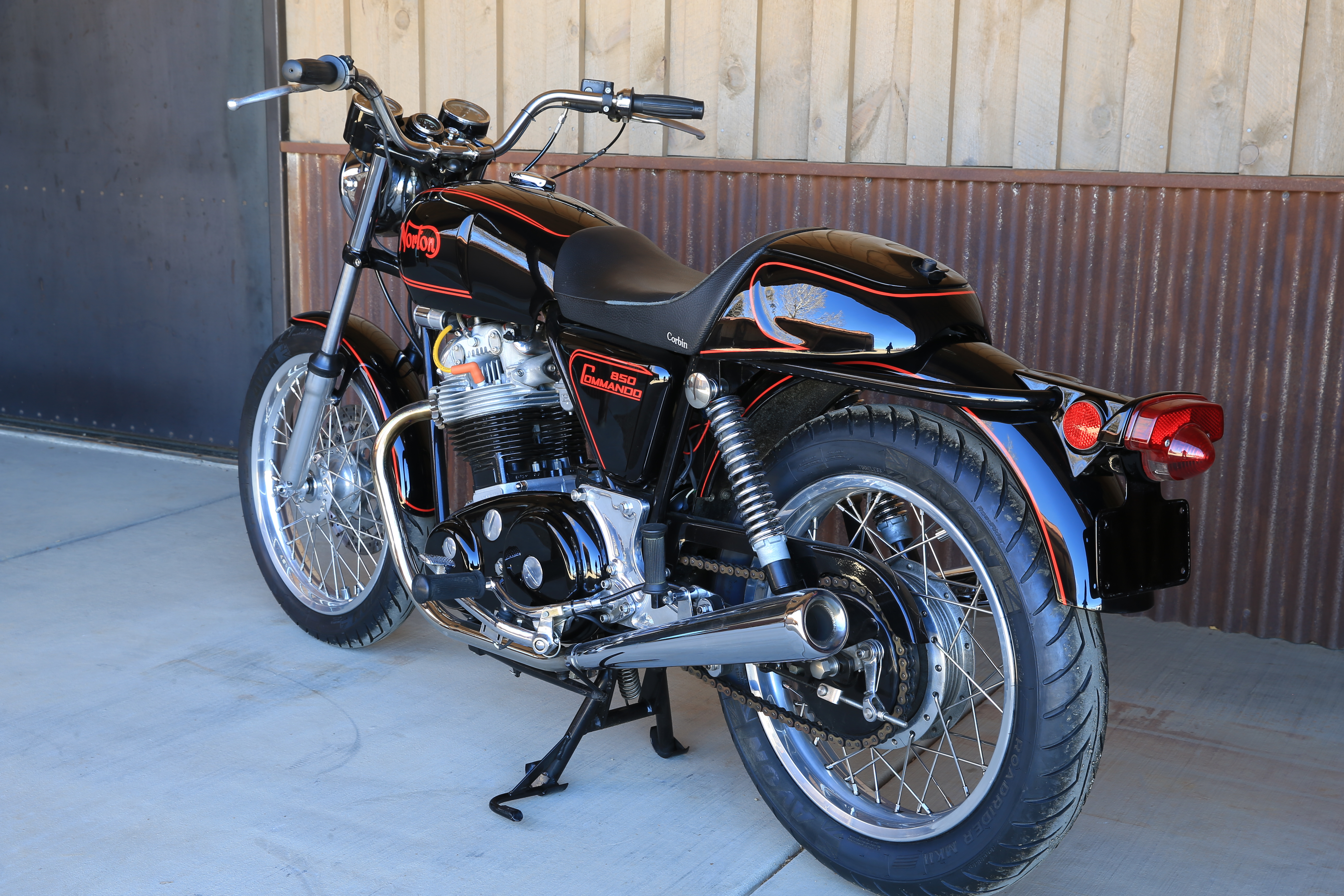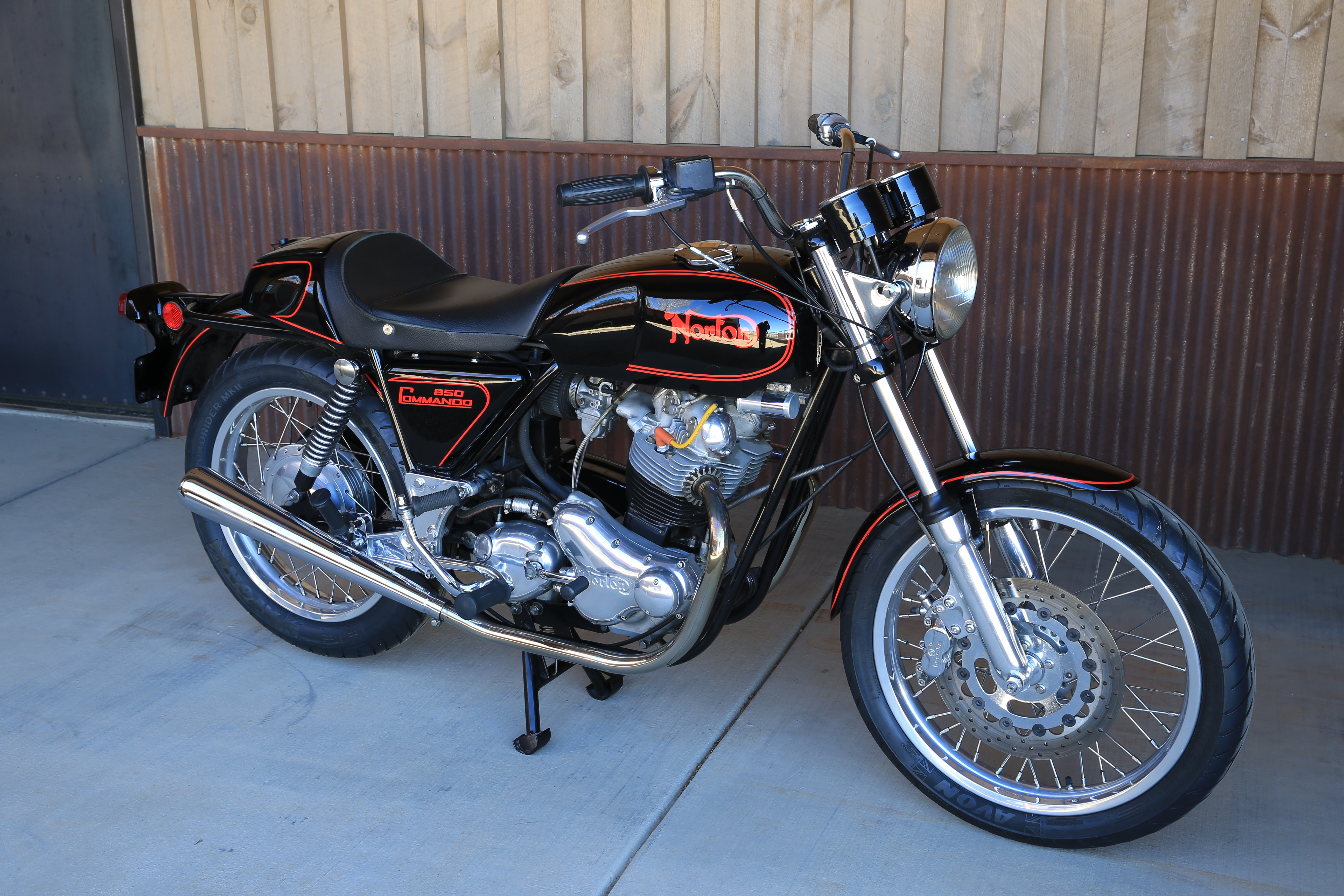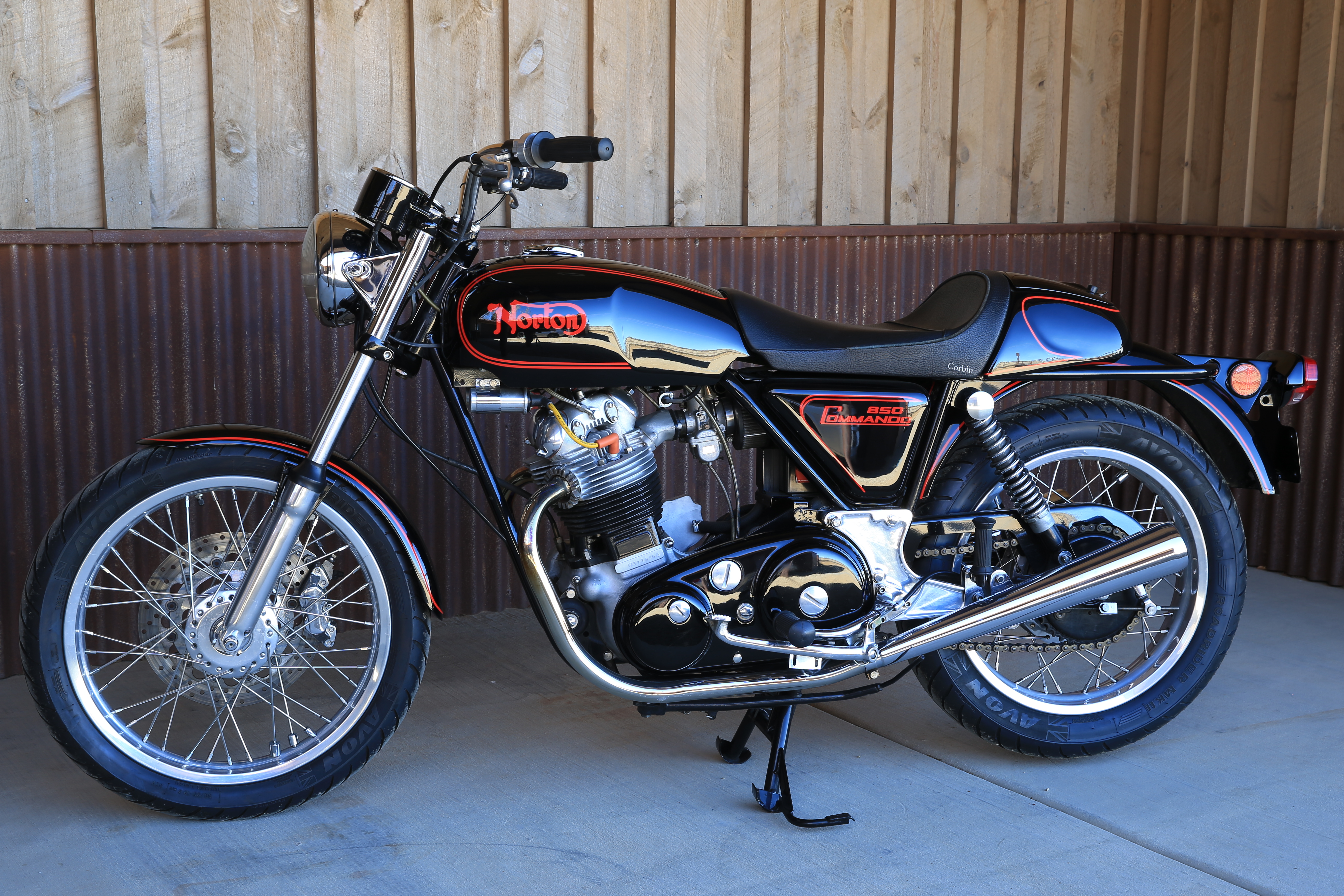 - Brief description: Very bold looking machine with its Red frame and Black body work. Like new condition with low miles. Very well taken care of. Option equipment includes Electronic gauges, a 1″ lowering kit, cNw Cafe’ LED turn signals and the awesome cNw dual Keihin carburetor kit. Bike is a 1971 frame and gear box but uses a 1974 850cc engine. As many will agree, the 1974 was maybe the best year of all Commando engines. It is ready to start enjoying and this bike makes a statement few British bikes can match.